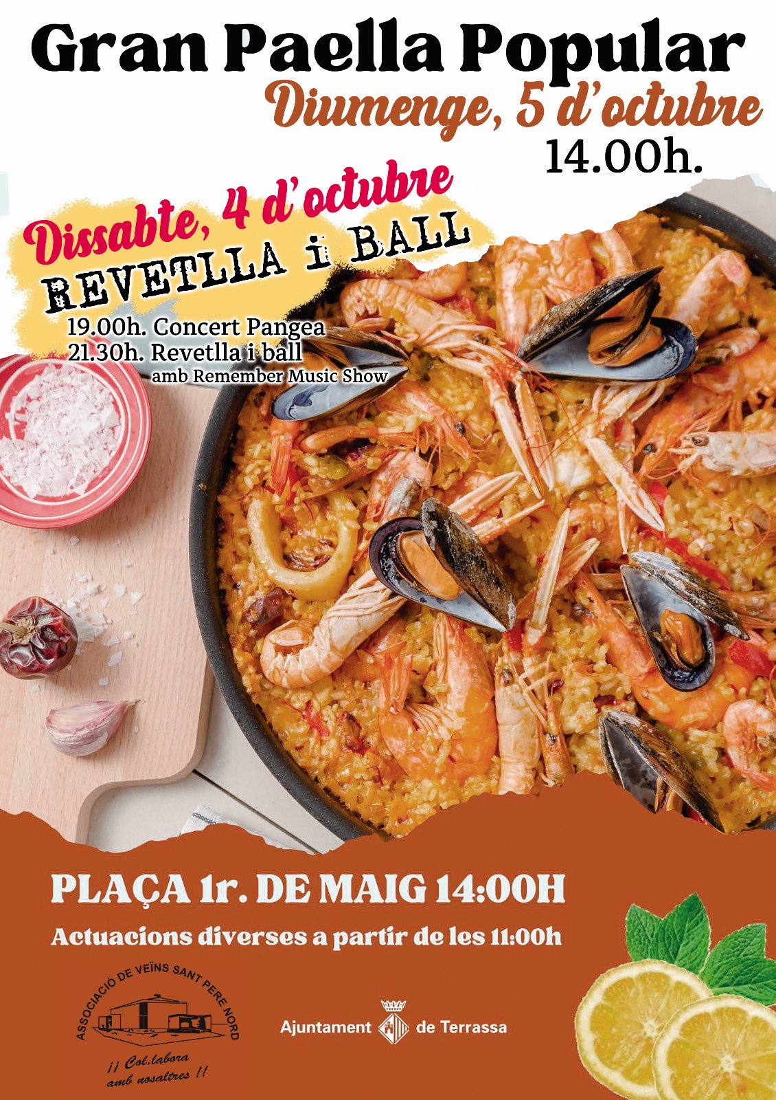 L'Associació de Veïns i Veïnes de Sant Pere Nord organitza els dies 4 i 5 d'octubre una nova edició de la Festa de la Tardor - Paellada. El plat central de la trobada serà la paellada popular de diumenge, que es cuinarà a càrrec de la Hermandad San José de Abrucena. Es preparan dues paelles, una amb carn i una altra vegetariana, amb la voluntat que tothom en pugui gaudir. Els tiquets es podran comprar el mateix diumenge a la plaça del Primer de Maig, mentre que els socis de l'associació hi estan convidats.