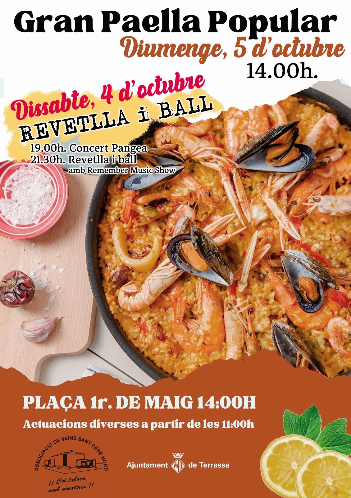 El diumenge 5 d'octubre, mentre es cuinen les paelles, hi haurà l'actuació dels Diables de Sant Pere Nord (11 hores) i una exhibició dels alumnes del gimnàs Kimura (12 hores). A les 14 hores es repartiran les paelles i, per amenitzar la sobretaula, a partir de les 15 hores tindrà lloc el concert del duo Pangea.