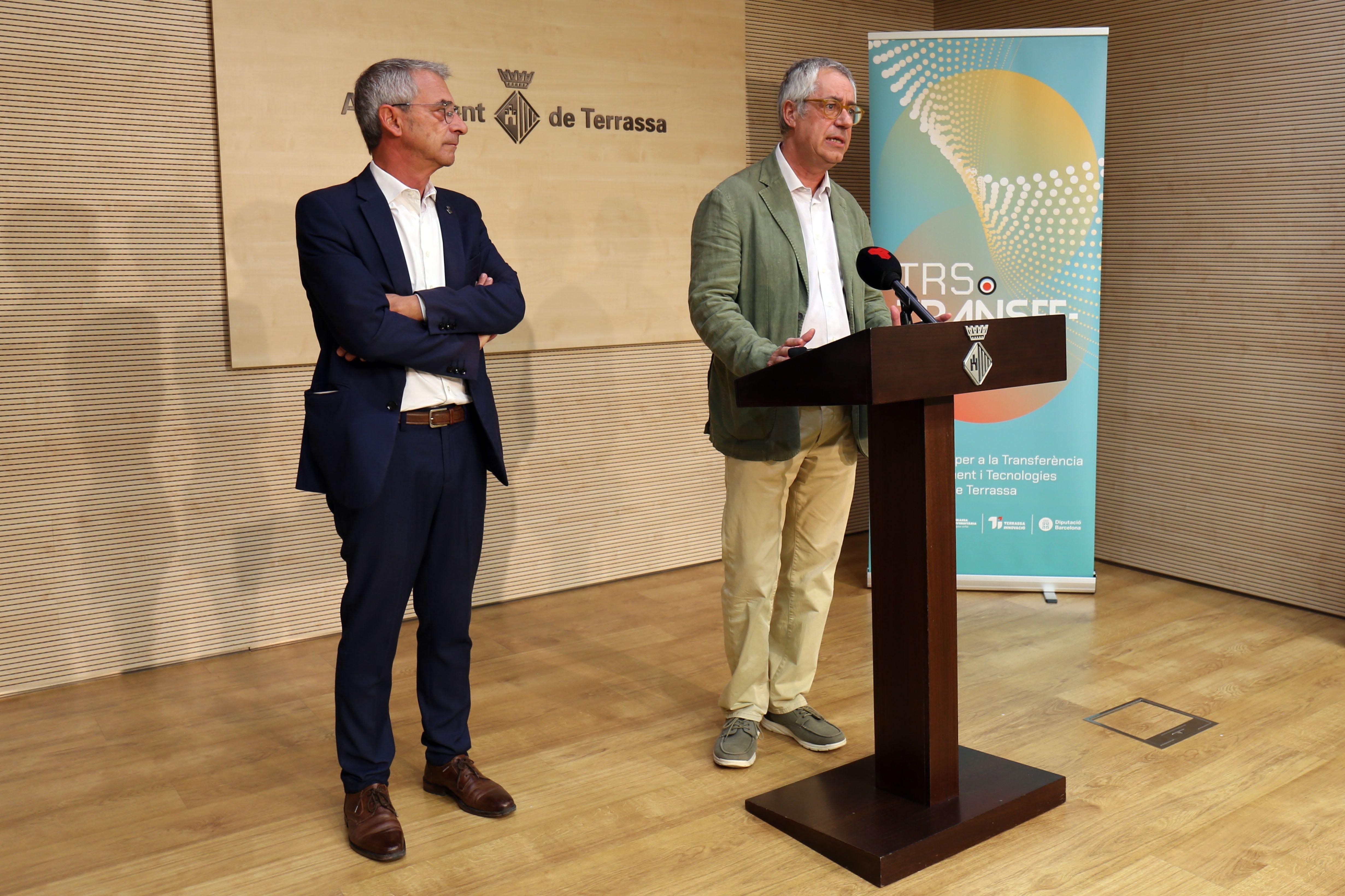El tinent d’alcalde de Projecció de la Ciutat i regidor d’Universitats i Transferència de Coneixement, Joan Salvador; i el subdirector de Recerca i Empresa de l’Escola Superior d’Enginyeries Industrial, Aeroespacial i Audiovisual de Terrassa (ESEIAAT) de la Universitat Politècnica de Catalunya (UPC), Lluís Gil; han ofert aquest dimecres al matí una roda de premsa a la sala de premsa de l’Ajuntament per presentar la IV Jornada de Transferència de Coneixement i Tecnologia, que tindrà lloc el dijous 30 d’octubre a la sala d’actes de l’ESEIAAT – UPC, i les accions previstes aquesta tardor emmarcades en el Pla d'Impuls per a la Transferència de Coneixement i Tecnologies Emergents de Terrassa.